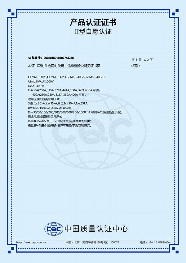 GLM6L-400-630自愿认证证书