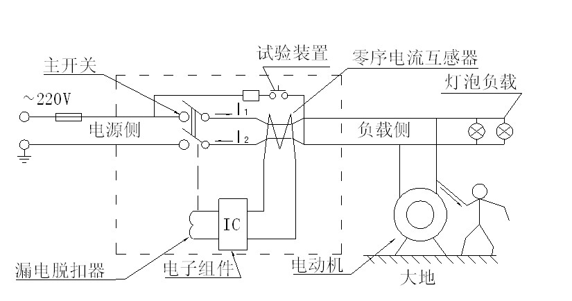 工作原理: 当有触电或漏电故障时,I1和I2不相等,即矢量和不为零,零序电流互感器的次级有感应电压产生,当达到整定值后通过漏电脱扣器使自动开关在<0.1s内切断电源,从而起到漏电保护作用。