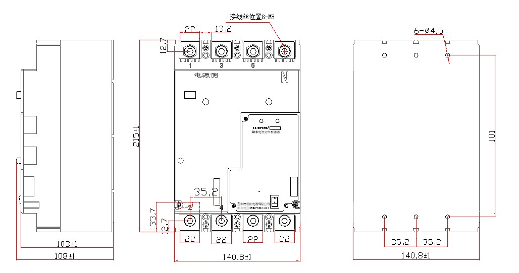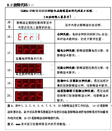 Îå¡¢¹¤×÷Ìõ¼þ 5.1 ÊÊÓ¦ÔÚ»·¾³Î¶ÈΪ-5¡æ- +40¡æ£»Ïà¶Ôʪ¶È£¼90%£»º£°Î²»³¬¹ý 00Ãס£ 5.2 ¶Ï·Æ÷Ó¦°²×°ÔÚ¸ÉÔͨ·ç¡¢·À³¾¡¢·ÀÖ¹Óк¦ÆøÌå¡¢Ô¶Àë´Å³¡¡¢·ÀÖ¹Õ𶯡¢Ì«Ñôֱɹ£¬ÓêË®ÇÖÊ´£¬¹Ì¶¨ÔÚÒ»¶¨¸ß¶È±ãÓÚ²Ù×÷µÄµØ·½¡£ Áù¡¢°²×°¶Ï·Æ÷ 6.1 Çë²ÎÕÕ¶Ï·Æ÷½ÓÏßͼ½ÓÏß¡£ 6.2 ¶Ï·Æ÷Ó¦´¹Ö±°²×°£¬ÑϽûˮƽ»òµ¹Öð²×°£¬ÓÃÂݶ¤Í¨¹ý°²×°¿×¹Ì¶¨¡£ 6.3 ²úÆ·Éϲà1¡¢3¡¢5¡¢NΪµçÔ´½øÏ߲࣬·Ö±ð¶ÔÓ¦ÏàÏßC¡¢ B¡¢AºÍµçÔ´ÖÐÐÔÏߣ¨ÁãÏߣ©N£¬Ï²à2¡¢4¡¢6¡¢NΪ¸ºÔزà½ÓÏß¡£ 6.4 µçÔ´½ø³öÏßӦѡÓÃ×ã¹»Ãæ»ýµÄ¹ý¶É½ÓÏß×°Öûòµ¼Ïß(µ¼Ïß½ØÃæ»ý£º250A>65mm2 )£¬½ø³öµ¼ÏߵľøÔµµçѹ´óÓÚ500V£¬ÒÔÂú×ã¶Ï·Æ÷¼°Óû§¸ºÔصÄʹÓÃÒªÇó¡£ 6.5 ½ÓÏßÂÝË¿Á¦¶ÈÒªÊʶȣ¬ÒÔ·ÀÖ¹½ÓÏßÂÝË¿Ëɶ¯£¬ÉÕ»µ½ÓÏß¶Ë×°Öà Æß¡¢¹¦ÄܽéÉÜÓë²Ù×÷ʹÓà 7.1 ¶Ï¿ªÖ¸Ê¾£¬ÏÔʾ¶Ï·Æ÷µÄÄÚ²¿¹¤×÷״̬£¬µ¯³öΪ¶Ï¿ª£¬ÎüÈëΪ½Óͨ¡£ 7.2 ÊÖ¶¯¶Ï¿ª£ºÔÚÎÞ¸¨ÖúµçÔ´»òµçÔ´µçѹÓйÊÕϼ°ÆäËü½ô¼±Çé¿öÏ£¬Ç¿Ðа´ÊÖ¶¯¶Ï¿ª°´Å¥£¬¿ª¹ØÄÜѸËÙ¶Ï¿ª¡£Í¬Ê±Ó¦½«¶Ï·Æ÷Ãæ°åµçÉϵĺϷÖÕ¢¿ª¹ØÖÃÓÚ·ÖբλÖ㬷ÀÖ¹ÓÉÓÚµçÔ´Í£µç¸´Ë͵çÔì³É¶þ´ÎºÏÕ¢¡£ 7.3¶Ï·Æ÷ÕýÃæÁ½Ö»Ö¸Ê¾µÆ×÷Ó㺠µçÔ´½Óͨ£¨Â̵ƣ©¨D¨DָʾµÆÁÁ±íʾ¹©µç²àµçÔ´½Óͨ£» ºÏÕ¢Ë͵磨ºìµÆ£©¨D¨DָʾµÆÁÁ±íʾ¶Ï·Æ÷£¬¾ÊÖ¶¯»òµç¶¯ºÏÕ¢ºó£¬¶Ï·Æ÷ÄÚ²¿¿ª¹ØÒѽÓͨ²¢Ïò¸ºÔØË͵硣 7.4ºÏ·ÖÕ¢¿ª¹Ø£ºÓÃÓÚ²Ù×÷¶Ï·Æ÷×Ô¶¯ºÏ·ÖÕ¢ 7.5ÊÖ¶¯ºÏ·ÖÕ¢ÊÖ±ú£ºÓÃÓÚÊÖ¶¯²Ù×÷¶Ï·Æ÷ºÏ·ÖÕ¢ 7.6 ©µçÊÔÑé°´Å¥£ºÓÃÀ´¶Ô¶Ï·Æ÷Ê©¼ÓÒ»¶¨Á¿µÄ©µçµçÁ÷£¬ÑéÖ¤¶Ï·Æ÷ÊÇ·ñ¿É¿¿¶¯×÷¡£ 7.7Ê£Óද×÷µçÁ÷É趨£ºÐý×ªÃæ°åÉÏÊ£ÓàµçÁ÷¶¯×÷É趨£¨mA£©Ðýת¿ª¹Ø£¬ÊÖ±úÉϵļýÍ·ËùÖ¸¶¨Î»µã²ÎÊý¼´ÎªÉ趨µÄÊ£ÓàµçÁ÷¶¯×÷Öµ£» 7.8¹¤×÷µçÁ÷É趨£ºÐý×ªÃæ°åÉϹ¤×÷µçÁ÷É趨£¨A£©Ðýת¿ª¹Ø£¬ÊÖ±úÉϵļýÍ·ËùÖ¸¶¨Î»µã²ÎÊý¼´ÎªÉ趨µÄ¹¤×÷µçÁ÷Öµ¡£ 7.9ÄÚ²ØÈý¸ö¹¦Äܲ¦¶¯¿ª¹Ø£º ¢Ù©µç±£»¤Í˳ö£ºµ±±£»¤Æ÷Äڲؿª¹Ø²¦µ½Í˳öλÖ㬱£»¤Æ÷ÎÞ©µç±£»¤¹¦ÄÜ£¬Ö»×ö¹ýÁ÷¼°¶Ì·±£»¤ÓᣠעÒ⣺Í˳ö¹¦Äܹ©×¨ÒµÈËÔ±ÔÚ¼ìÐ޵緹ÊÕÏʱʹÓÃÍ⣬ÆäËûÈËÔ±ÇëÎðʹ Óô˹¦ÄÜ¡£ ¢Ú¹ýÁ÷Í˳öÑ¡Ôñ£ºµ±±£»¤¿ª¹Ø²¦µ½Í˳öλÖÃ, ±£»¤Æ÷ÎÞ¹ýµçÁ÷±£»¤×÷ÓÃ,Ö»×÷©µç¼°¶Ì·±£»¤Óᣠ¢Û·Ö¶Ïʱ¼ä300ms¡¢500msÑ¡Ôñ£º¶Ï·Æ÷¼ì²âµ½Ê£ÓàµçÁ÷µ½¶Ï·Æ÷·Ö¶ÏµÄʱ¼äÑ¡Ôñ300ms¡¢500ms£¬ºÏÀíµÄÑ¡Ôñ·Ö¶Ïʱ¼ä¿ÉÒÔ±ÜÃâ¶Ï·Æ÷µÄÔ½¼¶¶¯×÷¡£ 7.10Ö÷Òª¹¤×÷״̬ÃèÊö£º¢Ù×Ô¶¯¸ú×ÙµÄͶÈëÓëÍ˳ö£ºµ±¶Ï·Æ÷Ãæ°åÉÏÊ£ÓàµçÁ÷¶¯×÷É趨£¨mA£©Ðýת¿ª¹ØÊÖ±ú¼ýÍ·Ö¸Ïò×Ô¶¯¸ú×Ùʱ£¬Â©µç±£»¤µÄÕû¶¨Öµ½«¸ù¾ÝÏß·µÄʵ¼ÊÇé¿öÔÚ50mA¡«500mA×Ô¶¯µ÷Õû£¬ÈôÊÖ±ú¼ýͷתÀë´Ë´¦Ôò×Ô¶¯¸ú×Ù¹¦ÄÜÍ˳ö£¬Ê£ÓàµçÁ÷¶¯×÷Öµ×ñÑÊÖ¶¯É趨ֵ¡£(Ïê¼û¸½Â¼A) ¢ÚͨÐŵÄͶÈëÓëÍ˳ö£ºµ±¶Ï·Æ÷Ãæ°åÉϹ¤×÷µçÁ÷É趨£¨A£©Ðýת¿ª¹ØÊÖ±ú¼ýÍ·Ö¸ÏòͨÐÅͶÈëʱ£¬¶Ï·Æ÷µÄÊ£ÓàµçÁ÷¶¯×÷Öµ¼°¹¤×÷µçÁ÷É趨ֵ½«°´Í¨¹ýRS485ͨÐÅÉèÖõIJÎÊýÔËÐУ¬Ðýת¿ª¹ØÉèÖÃÎÞЧ¡£ÈôÊÖ±ú¼ýͷתÀë´Ë´¦ÔòͨÐŹ¦ÄÜÍ˳ö¡£ 7.11ÊýÂëÏÔʾ¹Ü£ºÏÔʾ¶Ï·Æ÷¹¤×÷״̬¼°¹ÊÕÏ´úÂë¡££¨Ïê¼û¸½Â¼B£© 7.12ÊÖ¶¯ºÏ·ÖÕ¢ÊÔÑé 7.12£1 ¸¨ÖúÊÖ¶¯²Ù×÷Ê£ÓàµçÁ÷¶¯×÷¶Ï·Æ÷·Ö¶ÏÓë½Óͨ ÊÖ¶¯ÓÃÔ¼10NµÄÁ¦ÉÏÏÂÖØ¸´°â¶¯Ê£ÓàµçÁ÷¶¯×÷¶Ï·Æ÷¸¨ÖúºÏ·ÖÕ¢ÊÖ±úÊý´Î£¬Ö±ÖÁÌýµ½¡°…硱µÄÒ»Éù¶Ï¿ªÖ¸Ê¾ÎüÈë¡¢¶Ï·Æ÷ÄÚ²¿½Óͨ¡£ 7.12£2ÊÖ¶¯¶Ï¿ªÊ£ÓàµçÁ÷¶¯×÷¶Ï·Æ÷ £¨1£©Ö±½Ó°´ÊÖ¶¯¶Ï¿ª°´Å¥¡¢Ìýµ½¡°…硱µÄÒ»Éù¡¢¶Ï¿ªÖ¸Ê¾µ¯³ö£¬¼´Ê£ÓàµçÁ÷¶¯×÷¶Ï·Æ÷ÄÚ²¿¶Ï¿ª¡£ £¨2£©ÊÖ¶¯ÓÃÔ¼10NµÄÁ¦ÉÏÏÂÖØ¸´°â¶¯Ê£ÓàµçÁ÷¶¯×÷¶Ï·Æ÷¸¨ÖúºÏ·ÖÕ¢ÊÖ±úÊý´Î£¬Ö±ÖÁÌýµ½¡°…硱µÄÒ»Éù¶Ï¿ªÖ¸Ê¾µ¯³ö¡¢¼´Ê£ÓàµçÁ÷¶¯×÷¶Ï·Æ÷ÄÚ²¿¶Ï¿ª¡£ 7.13 ×Ô¶¯ºÏÕ¢ ¾¼ì²é½ÓÏßÎÞÎóºó·½¿ÉË͵çÊÔÑ飬½Óͨ¹©µç²àµçÔ´£¬¶Ï·Æ÷Ãæ°åÉϵĵçÔ´½ÓͨµÆÁÁ£¬ÔÙ½Óͨ¶Ï·Æ÷ÉϵĺϷÖÕ¢¿ª¹Ø¡¢Ô¼10sµç¶¯ºÏÕ¢ºó£¬¶Ï¿ªÖ¸Ê¾×Ô¶¯ÎüÈ룬£¨´ËʱӦÄÜÌýµ½¡°…硱µÄÒ»ÉùºÏÕ¢Éù£©Æä¶Ï·Æ÷ÄÚ²¿ÒѽÓͨ£¬Ë͵çºÏÕ¢µÆÁÁ£¬²¢Ïò¸ºÔزàË͵硣 7.14ÊÔÑ飺 Çᰴ©µçÊÔÑé°´Å¥¡¢¶Ï·Æ÷Ó¦Á¢¼´·Ö¶Ï¾-60 sÖØºÏÕ¢ºó£¬5ÃëÄÚÔÙ°´Â©µçÊÔÑé°´Å¥£¬¶Ï·Æ÷Ó¦Á¢¼´·Ö¶Ï²¢±ÕËø.²»ÔÚ×Ô¶¯Öغϡ£ 7.15²úÆ·ÔÚ°´¹æ³Ì°²×°Ë͵çÊÔÑéÕý³£ºó£¬Ó¦½«¹¦ÄÜ¿ª¹Ø¸Ç°åÓ÷âÇ©·âÉÏ£¬·ÇרҵÈËÔ±²»µÃÉÃ×Ô´ò¿ª¡£ °Ë¡¢¾´¸æ 8.1±¾²úÆ·¹¦ÄÜÑ¡ÔñÇë°´GB13955-05¡¶Ê£ÓàµçÁ÷¶¯×÷±£»¤×°Öð²×°ºÍÔËÐС·»òDL/T499-01¡¶Å©´åµÍѹµçÁ¦¼¼Êõ¹æ³Ì¡·ÖÐÏà¹ØÒªÇóʹÓᣠ8.2ÇëÄúÑϸñ°´ÕÕÏà¹Ø¹æ