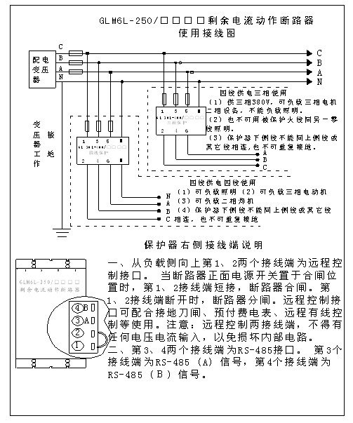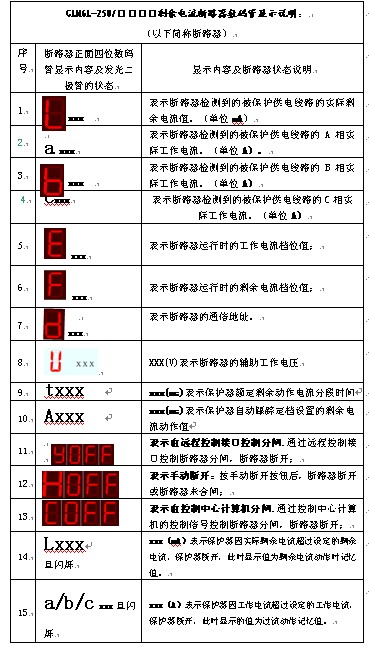 ʹÓÃ˵Ã÷£¨ÊýÂë¹ÜÏÔʾÐÍ£© Ò»¡¢²úÆ·¼ò½é GLM6L-250/¡õ¡õ¡õ¡õÊ£ÓàµçÁ÷¶¯×÷¶Ï·Æ÷(ÒÔϼò³Æ¶Ï·Æ÷),ÄÚ²¿ÓÉÈýÏàËÄÏß»òÈýÏàËļ«ÖÇÄܵç×Ó¹ýÁ÷ÐͶÏ·Æ÷×é³É¡£²úÆ·¾ßÓЩµç¡¢µç×Ó¹ýÁ÷¡¢¶Ì·±£»¤¹¦ÄÜ£»ÁôÓÐRS-485ͨÐŽӿڣ¬¿ÉʵÏÖÔ¶³Ì¿ØÖÆ£¬¹¤×÷µçÁ÷ÔÚ250AÒÔϵÄÖÇÄÜÐ͵çÁ¦¸ººÉ¿ª¹Ø¡£ ²úÆ··ûºÏGB14048.2µÈ±ê×¼µÄÒªÇó¡£Ö§³ÖDL/T645¶à¹¦ÄܵçÄܱíͨÐÅÐÒé¡£ ²úÆ·ºÏÕ¢·½Ê½ÎªÊÖ¶¯¡¢µç¶¯Ò»Ìåʽ¡£ ¶þ¡¢²úÆ·ÓÃ; ²úÆ·ÓÃÓڶµçѹ380 /50Hz¹¤×÷µçÁ÷ÔÚ250AÒÔÏ£¬ÈýÏàËÄÏß¡¢ÈýÏàÈýÏß¶¯Á¦¼°2Vµ¥ÏàÕÕÃ÷µç·ÖУ¬×÷ÈËÐó½Ó´¥´øµçÌåÆð¼ä½Ó²¹³ä±£»¤Ê¹ÓᣲúÆ·¶Ô¹©µçÏß·¡¢ÓõçÉ豸ÓЩµç¡¢¹ýÔØ¡¢¶Ì·±£»¤×÷ÓᣲúÆ·ÁôÓÐRS-485½Ó¿Ú£¬×÷ΪԤ¸¶·Ñµç¶È±í¿ØÖÆ¿ª¹Ø¡¢¸÷ÖÖÐÅÏ¢Ô¶³Ì¿ØÖÆÓë´«µÝÖ®ÓᣲúÆ·½á¹¹¿É¿¿£¬°²×°·½±ã£¬ÊÊÓÃÓÚ¹¤¿óÆóÒµ,ÒÆ¶¯Óõ糡Ëù£¬µçÍø×ª»»µÄ¶à¼¶±£»¤¡£ ²úÆ·ÔÚ¹©µçÏß·Öиùé§ÐèÇó¿É×÷×ܱ£»¤£¬Ò²¿É×÷·Ö·±£»¤¡£ Èý¡¢¼¼Êõ²ÎÊý 3.1¶î¶¨¹¤×÷µçѹ£º AC 380V 50Hz 3.2 ¶î¶¨µçÁ÷£º AC 100A¡¢160A¡¢0A¡¢225A¡¢250A£¨¿Éµ÷£© 3.3¶î¶¨¸¨ÖúµçÔ´µçѹ£º AC 2V 50Hz 3.4 ¶î¶¨Ê£Óද×÷µçÁ÷£º AC 50mA¡¢ 100mA¡¢300mA¡¢400mA¡¢500mA¡¢£¨¿Éµ÷£© 3.5¶î¶¨Ê£Ó಻¶¯×÷µçÁ÷£º AC 25mA¡¢50mA¡¢150mA¡¢0mA¡¢250mA¡¢ 3.6¶î¶¨¼«ÏÞ¶Ì··Ö¶ÏÄÜÁ¦£º AC HÐÍ65kA SÐÍ35kA 3.7¶î¶¨Ê£Óද×÷µçÁ÷·Ö¶Ïʱ¼ä£º 0.3s¡¢0.5s 3.8 ¶¯×÷ÌØÐÔ£º ACÐÍ 3.9ºÏբʱ¼ä£º µç¶¯ºÏÕ¢µÄСÓÚ10s£»×Ô¶¯ÖغÏÕ¢µÄʱ¼äΪ-60s£» ËÄ¡¢²úÆ·³ß´çÓë½á¹¹